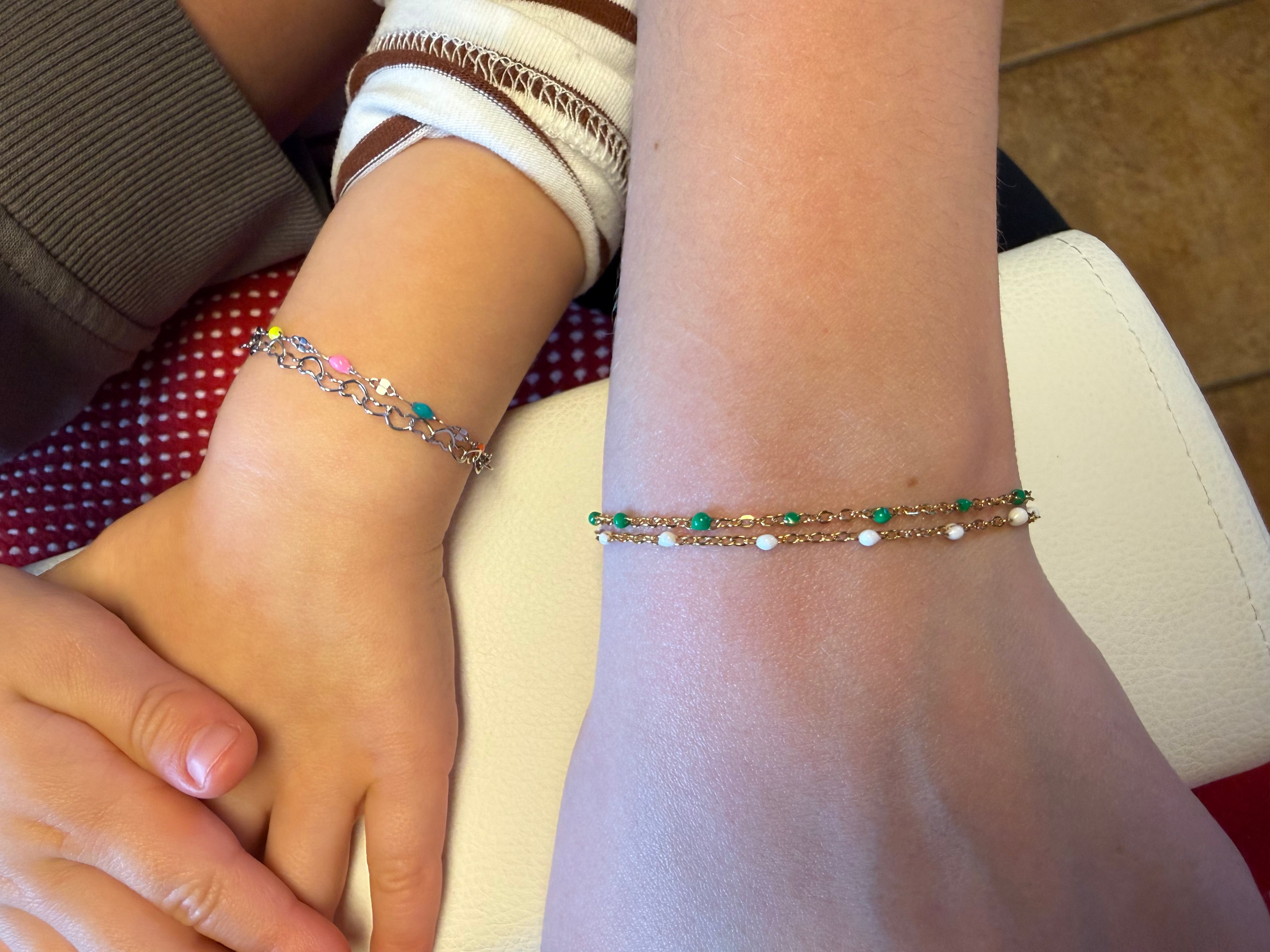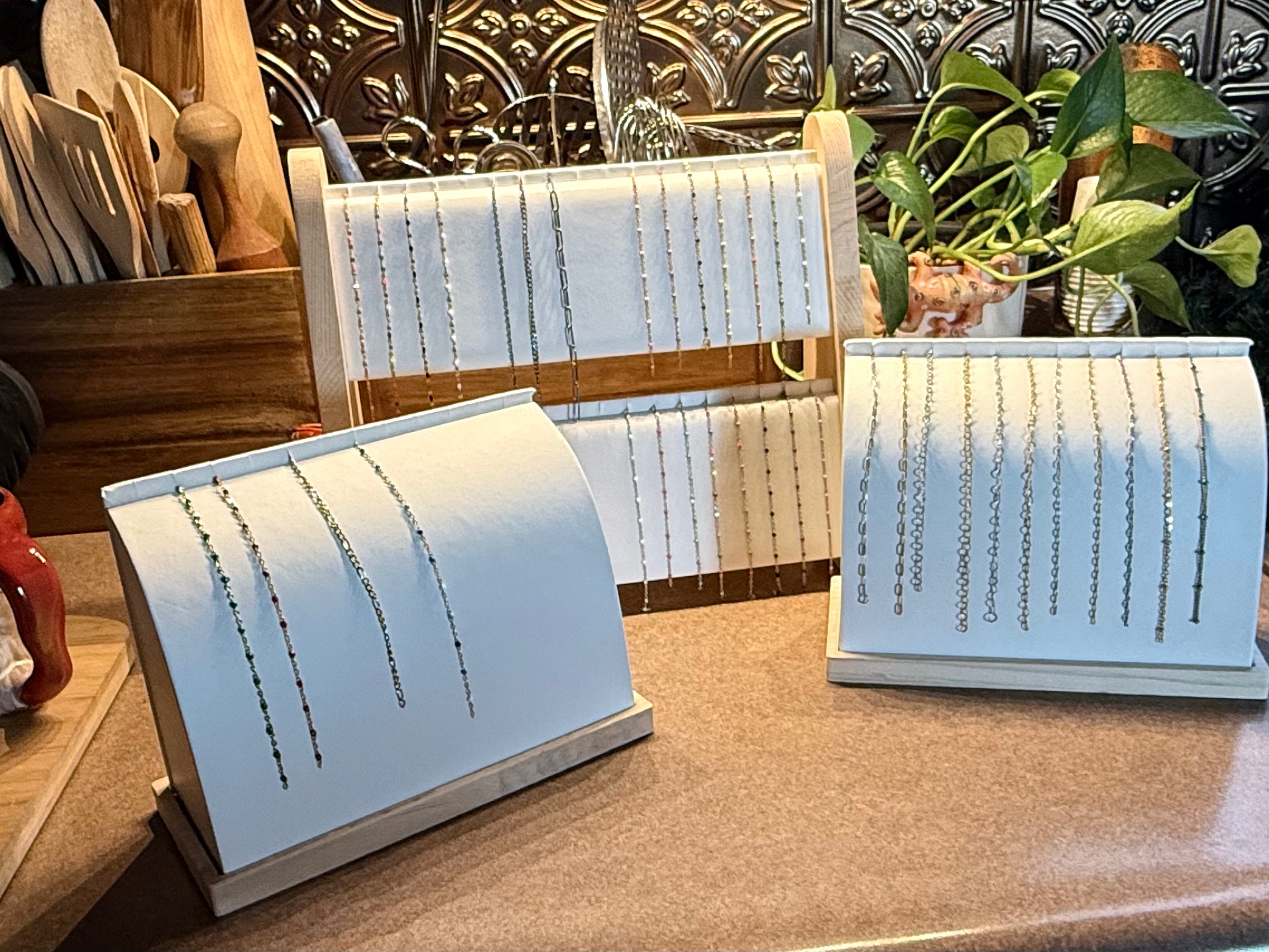 Pick from several stainless steel options in silver and gold. As well as colorful enameled beaded chain, a customer favorite.